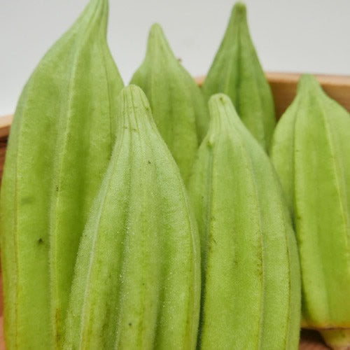 一般的なオクラに比べ、太くてどっしりした感じで、断面が綺麗な切れ込みが入った星形になっています。